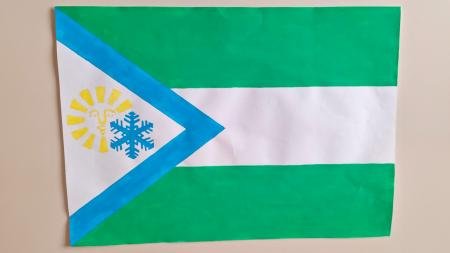 Se trata de una bandera que tiene dos franjas horizontales verdes con una blanca en el centro; a la izquierda, cerca del asta, un triángulo isósceles. Dentro de ese triángulo se ve un sol con nueve rayos y un cristal de nieve.